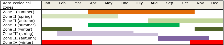 Figure 2. Potato growing season in the four agro-ecological zones in China (Sources: USDA, 2018; China, World Potato Atlas, CIP-collab, https://research.cip.cgiar.org).
