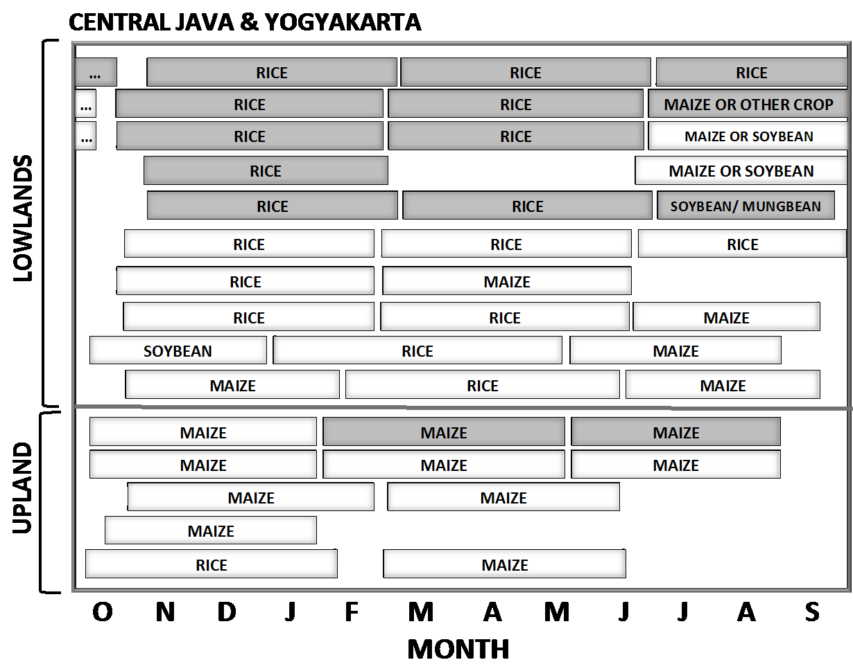 Cropping systems are very diverse and include different ecosystems (upland, lowland, swamps, tidal), and water regimes (rainfed and irrigated). Irrigated systems are most common for lowland (flooded) rice systems. Cropping intensity (for annual crops) varies from 1 to 3 crops per year. An example for maize- and rice-based cropping systems in Indonesia is shown for Central Java and Yogyakarta (Figure 1). In this region, October coincides with the onset of the rainy season for most areas and the rainy season continues until the end of March.