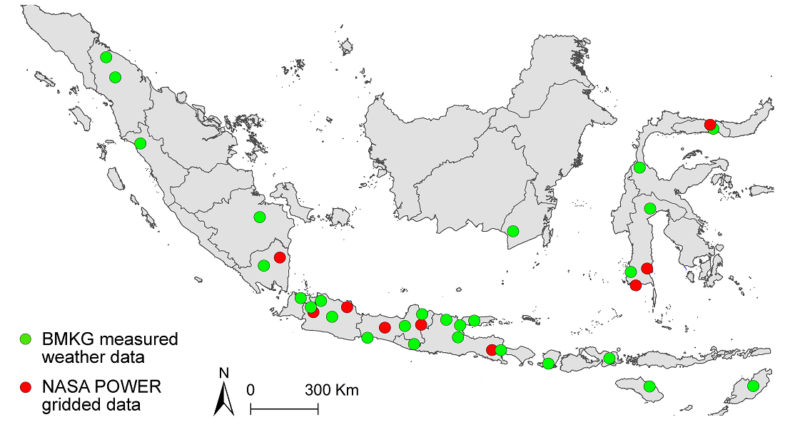 A total of 36 buffers were selected for Indonesia. These buffers account for 99% (irrigated rice), 94% (lowland rainfed rice), 58% (irrigated maize), and 89% (rainfed maize) of cropland area. These coverage values were calculated considering the climate zones where the selected buffers where located. We used the national meteorological station network of the Meteorology Climatology and Geophysics Agency (BMKG) as the main source of weather data. Daily weather data were available for the last 10-18 years for 28 buffers, including daily solar radiation, maximum and minimum temperature, humidity, and precipitation, but no daily weather data existed for 8 buffers; hence, NASA-POWER were used to generate weather data for them (NASA-POWER; NASA, 2012). Quality control and filling/correction of the weather data was performed based on correlations between the target Reference Weather Stations (RWS) and one to two adjacent weather stations following van Wart et al. (2013). Number of corrections/filled data was always lower than <3% for all variables.