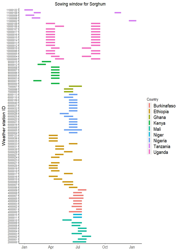 Figure 2. The sowing window to plant rainfed sorghum at the weather stations in sub-Saharan African countries; The name and information of each station are presented in Table 3.